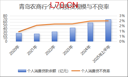 但“以价换量”的策略也带来了副作用,在规模快速扩张的同时,消费贷的不良率也随之攀升,部分银行已出现资产质量承压的迹象。青岛农商个人消费贷不良率在2020年之前维持在1%以下,2021年升至1.57%,此后逐渐攀升,2025年上半年末突破2%,达到2.01%峰值。