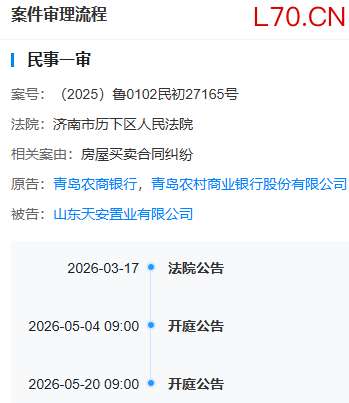 从案号来看,该案于2025年便已立案,案由为房屋买卖合同纠纷,青岛农商行为原告,天安置业为被告,一审将于5月份开庭。