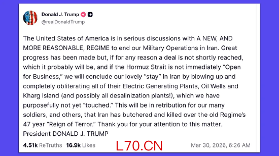 特朗普周一在 “真实社交” 发文威胁,若无法达成停战协议,将 “彻底摧毁” 伊朗的能源与水利设施。他称:“若霍尔木兹海峡不立即‘恢复通航’,我们将通过打击这些设施,结束在伊朗的‘愉快停留’。”