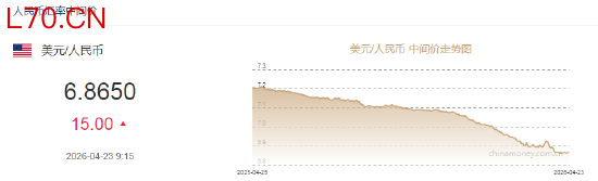 人民币兑美元中间价报6.8650,下调15点