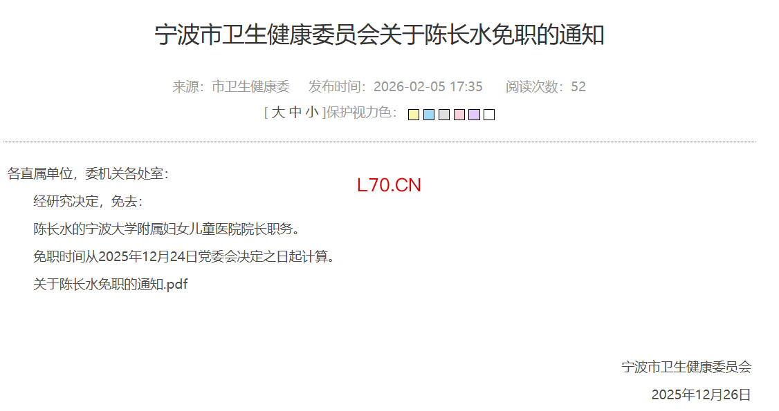 宁波卫健委:免去陈长水宁波大学附属妇女儿童医院院长职务