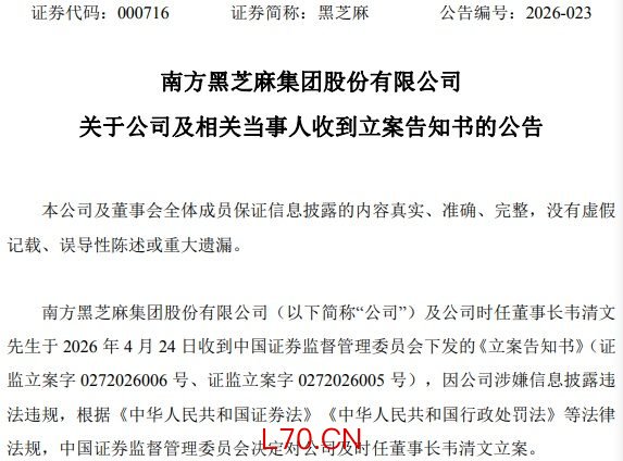 黑芝麻4月24日晚间公告,公司及公司时任董事长韦清文当日收到中国证监会下发的《立案告知书》,因公司涉嫌信息披露违法违规,中国证监会决定对公司及韦清文立案。